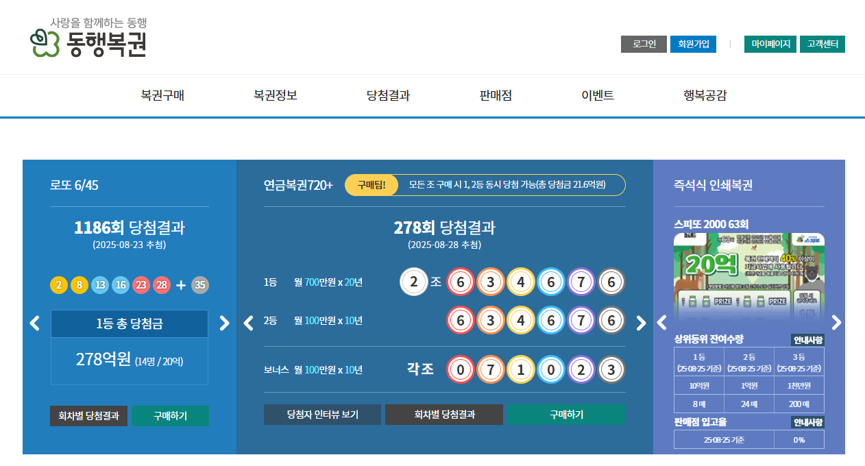 동행복권 홈페이지는 복권의 재미와 당첨의 기쁨을 안전하고 편리하게 경험할 수 있는 공식 플랫폼입니다. 24시간 언제든지 접속 가능한 온라인 서비스를 통해 다양한 복권을 구매하고, 투명한 추첨 과정을 통해 공정한 당첨 기회를 제공받을 수 있습니다.