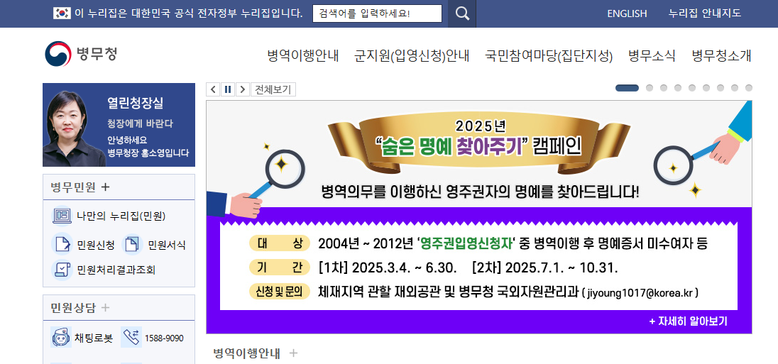 병무청 누리집은 대한민국의 병역 의무를 관리하는 국가기관인 병무청에서 운영하는 공식 홈페이지입니다. 이 사이트는 병역의무자들이 병역 관련 정보를 쉽게 접근하고 이해할 수 있도록 다양한 정보와 서비스를 제공하며, 국민의 병역 의무 이행을 돕고 관련 정책 및 서비스를 제공하는 주요 역할을 수행하고 있습니다.